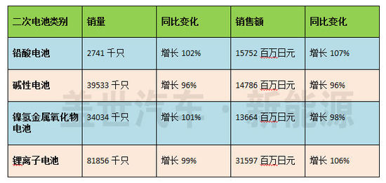 二次电池的出口总量为92565千只,同比增长86%,出口额为31455百万日元,同比增长84%。其中铅酸电池的出口总量为146千只,同比增长122%,出口额为1018百万日元,同比增长125%;镍镉电池的出口总量为2799千只,同比增长54%,出口额为252百万日元,同比增长51%;镍金属氢化物电池的出口总量11934千只,同比增长141%,出口额为4988百万日元,同比增长99%;锂离子电池的出口总量为71717千只,同比增长79%,出口额为19787百万日元,同比增长91%。
