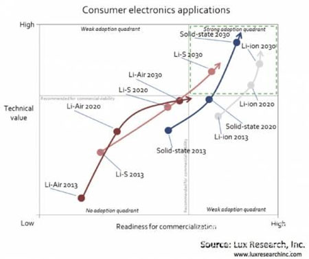 勒克斯报告中展示的固态电池和锂离子电池技术发展图