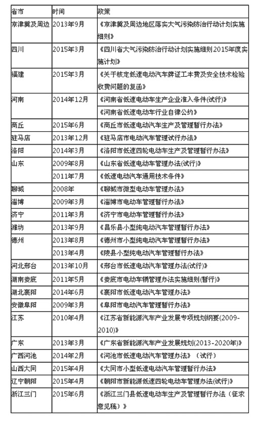 3月31日,四川省政府网站公布《省政府办公厅关于印发〈四川省大气污染防治行动计划实施细则2015年度实施计划〉的通知》。《实施计划》明确提出,加快推进低速汽车升级换代。各市(州)要结合实际对低速汽车(三轮汽车、低速货车)开展清理,在农村地区积极推广电动低速汽车。成为全中国第一个将扶持低速电动汽车明确写进省级文件的地区。