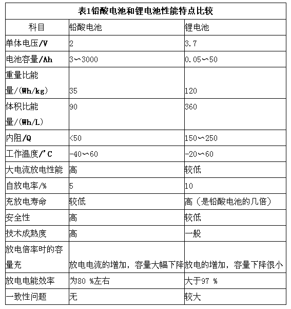 本文对这两种电池进行了性能比较,从表1中可以看出锂电池和铅酸电池的性能优劣。比较铅酸电池、锂电池的性能特点,可以看到铅酸电池具有容量高、工作温度范围宽、大电流放电性能好、自放电率低、安全性能好、技术成熟、成本低廉、可循环使用的优点,但体积比能量、重量比能量偏低,单体电压较低。而市场前景最被看好的锂电池虽然体积比能量、重量比能量高,单体电压高,但存在电池容量不大、大电流放电性能弱、技术不够成熟、安全问题突出、成本高、无法循环利用等问题。铅酸电池内阻小,瞬间大电流放电性能好,起动倍率高,而锂电池、镍氢电池的内阻大,起动倍率低。但是锂电池在充电寿命、放电倍率时的容量和充放电电能效率方面都具有铅酸电池无法比拟的优势。在低速电动车上,锂电除了重量轻和理论上的循环次数高以外,其余各项并没有优势。