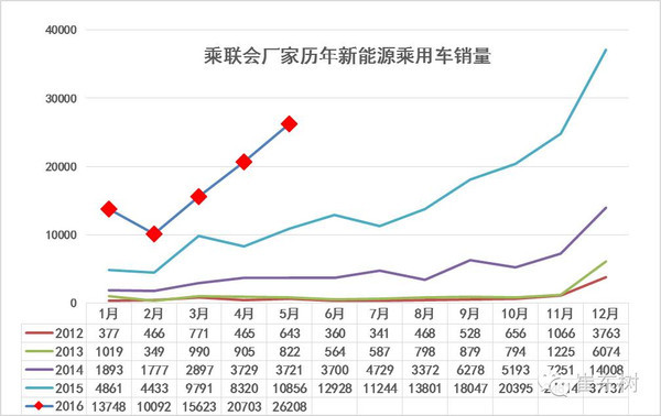 在十三五的新政策环境下,16年新能源乘用车市场呈现逐步恢复增长特征,1-2月受春节和政策因素影响而产销较低,3-5月逐步实现恢复性增长。根据乘联会的厂家销售数据,16年3-5月新能源乘用车市场呈现月度环比快速增长,市场持续走强的趋势。16年5月新能源狭义乘用车销量26208台,同比增长141%,环比4月增27%。16年1-5月的新能源乘用车总体销量8.6万台,同比增长126%,新能源乘用车增速相对健康合理。