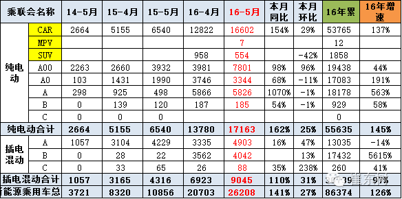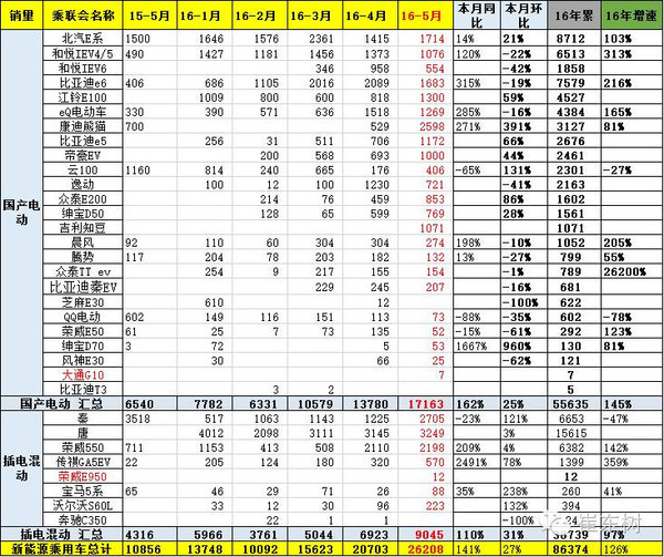 5月新能源乘用车呈现同比高增长和环比高增长的特征。16年5月新能源狭义乘用车销量26208台,同比增长141%,环比4月增27%,总体较好。其中插电混合动力达到9045台,同比增长97%,环比增长31%;纯电动车达到17163台,同比增长162%。环比增长25%。16年插电混动同比增速表现弱于纯电动轿车。