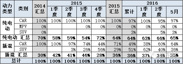 16年1季度纯电动乘用车中基本是轿车产品,前期的MPV\SUV逐步萎缩,2季度开始的江淮IEV6S的SUV开始增长上量,形成纯电动的SUV化探索。