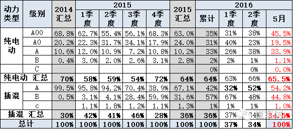 15年的纯电动车中的A00级车占比达63%,且A0级成为纯电动乘用车的绝对主力,这两类组合的经济型电动车成为主力。但16年1-5月的A级电动车爆发增长到纯电动份额的33%,这是长安、吉利电动增量和比亚迪等产品转型的原因,同时也是A0级电动车的暂时调整的影响。5月的微型电动车恢复,小型电动车被上下夹攻的趋势稍有体现。