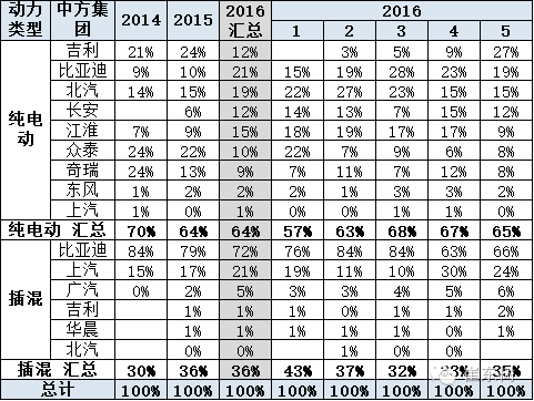 16年国企中的北汽、长安、江淮、奇瑞、上汽等在纯电动车的份额提升明显,但随着微型电动车的增量,纯电动的市场格局逐步发生变化。