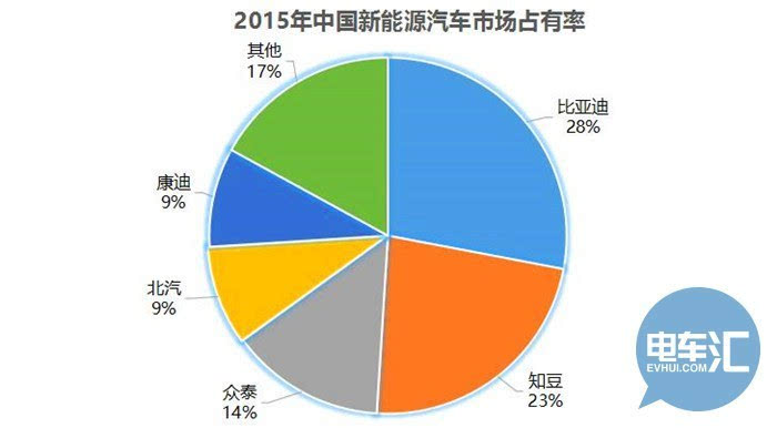 新能源汽车市场现状2015年中国新能源汽车中,比亚迪销量最多,为5万8000辆,市场占有率为28%。以小型电动车为主的知豆电动车销量接近5万辆,众泰云电动车销量约3万辆。北汽和康迪新能源汽车约2万辆。比亚迪,知豆,众泰,北汽,康迪成为目前中国规模较大的五家新能源汽车生产企业。