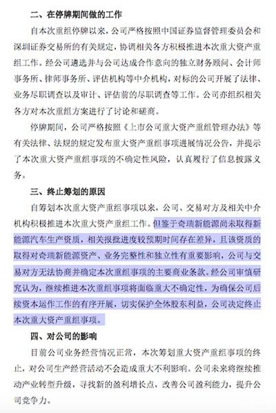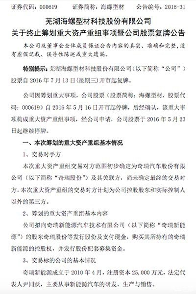 7月13日,芜湖海螺型材科技股份有限公司发布公告称鉴于奇瑞新能源尚未取得新能源汽车生产资质,经董事会决议决定放弃收购奇瑞新能源。