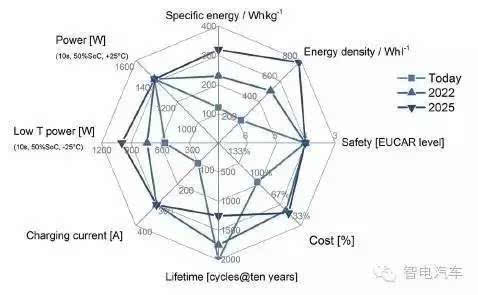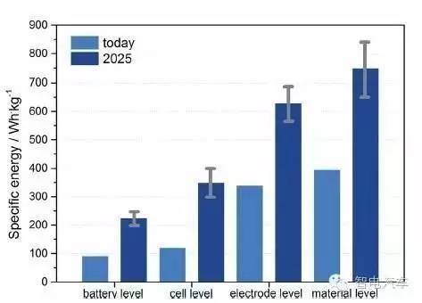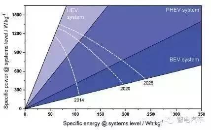 至2025年,如果BEV的续航里程普遍需要满足300mile,即482km的需求,电池系统的质量比能量密度至少需要提升2.5倍,功率密度提升1.5倍。