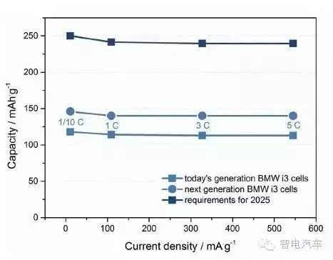 当我们聚焦电池能量密度的时候,还忽略了电池功率的问题,也就是充放电倍率。下图是目前及未来BMW i3电池的倍率性能。当从1/10C提高到5C,即单次放电时间从10h缩减到12min,电池的放电容量变化很小。