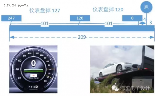 以国外特斯拉车主的案例来说,使用者开始对电动车是不熟悉的,车主使用的车辆是满电状态,仪表上显示剩余里程为247英里,从出发地Barstow到目的Kingman的充电站距离为209英里,预计的容差有38英里。车主开了高速走的100英里/时,实际的使用过程中:跑的里程要比电能跑的更快,跑了100英里之后,可用里程显示120英里,车主开始焦虑,关掉音响,调暗大屏幕,并且降下速度,以减少电池消耗。离Kingman还有7英里时,电量指示表已经显示零了,在到达目的地前的3英里处,电动车“趴窝”