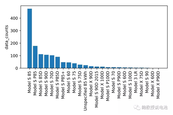 本文数据来源特斯拉车主收集的数据,车辆类型涵盖了Model_S、Model_X、Model_3的大部分车型,总共数据有1300多条,其中Model_S_85车型的数据最多,接近500条,各车型的数据条数分布见图1。