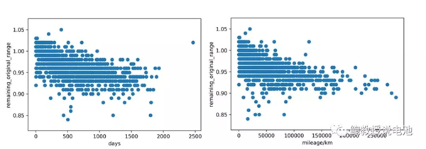 图2. 车辆续驶里程保持率与使用天数、车辆续驶里程保持率与使用里程的散点图
