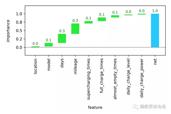 对自变量的重要性进行分析,发现使用天数和使用里程对模型的贡献最大,满充次数和车辆类型贡献次之,快充次数和亏电次数再次之,车辆使用区域、日常充电截止SOC、日常充电功率的贡献最小。