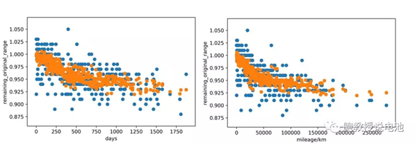 首先看一下车辆续驶里程保持率与使用天数、车辆续驶里程保持率与使用里程的关系,续驶里程保持率随着使用时间和使用里程的增长均呈现逐渐减小的趋势,但是数据比较分散。