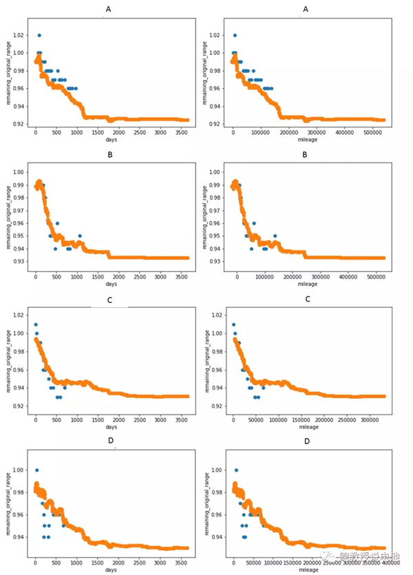 由于多数车辆的数据都只有几条,并且车主上报的数还可能由于测试方法不严格导致存在较大误差,因此只挑选了4辆车进行车辆续驶里程保持率预测。