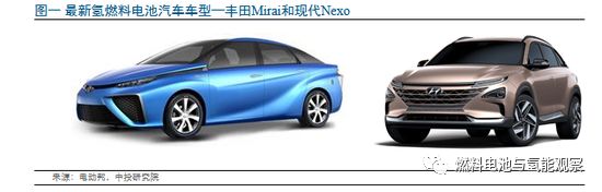 2014年12月丰田推出世界上第一款真正实现商业化大量销售的燃料电池汽车——Mirai,这是燃料电池汽车产业的里程碑式产品,Mirai续航里程达502km,储氢重量为5kg,而加氢时间仅需3分钟,功率密度达3.1kW/L,百公里加速为9.6s。