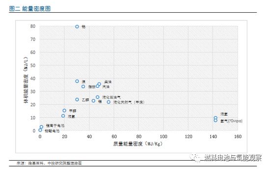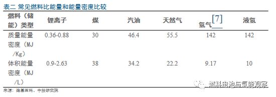 同其他燃料相比,氢的最大优势是超高的质量能量密度和可接受的体积能量密度(需压缩氢气或液化),常见燃料能量密度如表二所示: