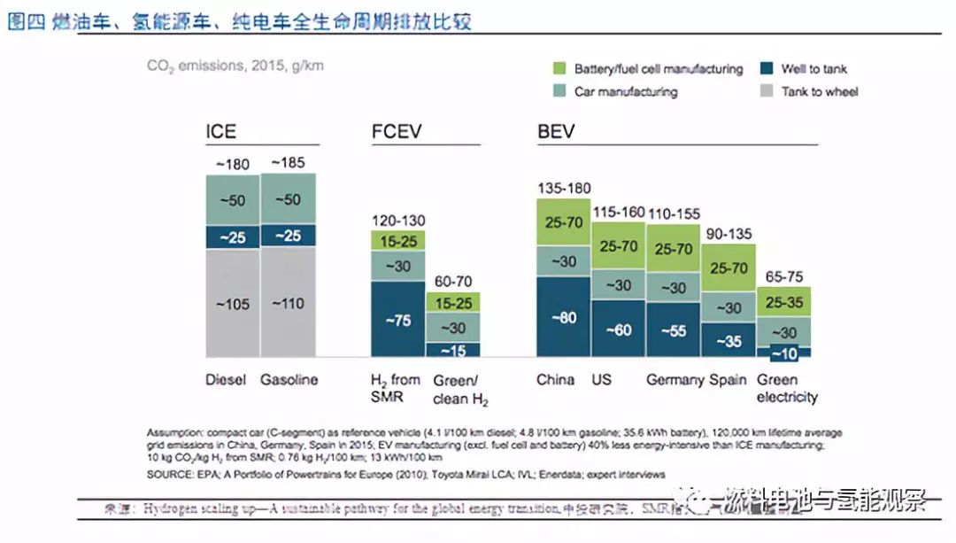 氢能源车全生命周期排放更占优势。氢燃料电池汽车的全生命周期排放,即包含汽车制造、电池制造、燃料(汽油、氢)或能源(发电)制备、汽车行驶全部环节的排放,不仅低于燃油车,也比纯电车更低。