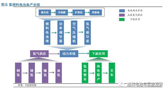 氢能及燃料电池产业链主要包括上游氢气供应的制氢、储氢、输氢和加氢环节,燃料电池动力系统本身的各个技术环节,以及下游的氢能整车等应用环节。其中,氢气供应是保证燃料来源的关键,燃料电池堆是产业链的核心,燃料电池动力系统是燃料电池应用的重要载体,燃料电池整车为燃料电池技术发展的最终目的。氢燃料电池车产业链见图五: