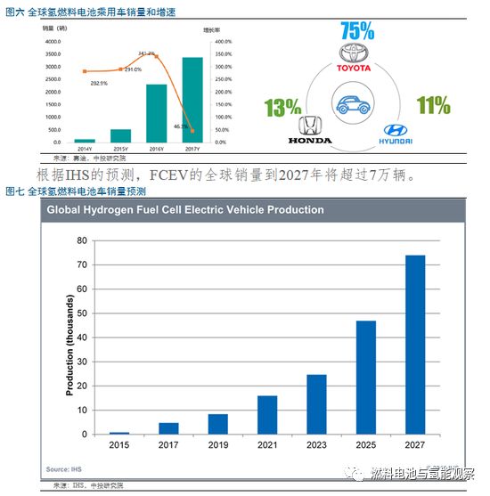 全球来看,燃料电池车乘用车的年销量还处在千辆数量级上,与燃油车接近1亿辆和电动车(纯电加混动)200万辆的数字相去甚远。但2014年丰田Mirai面世,带来燃料电池汽车销量增速的提升,市场开始升温。2013年到2017年底,全球总计售出6475辆氢燃料电池乘用车,其中丰田Mirai占比高达75%。