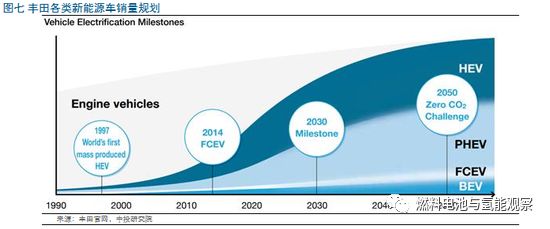 市场层面上,即使在目前氢燃料电池技术领先的丰田的远期战略规划中,各类技术也都有