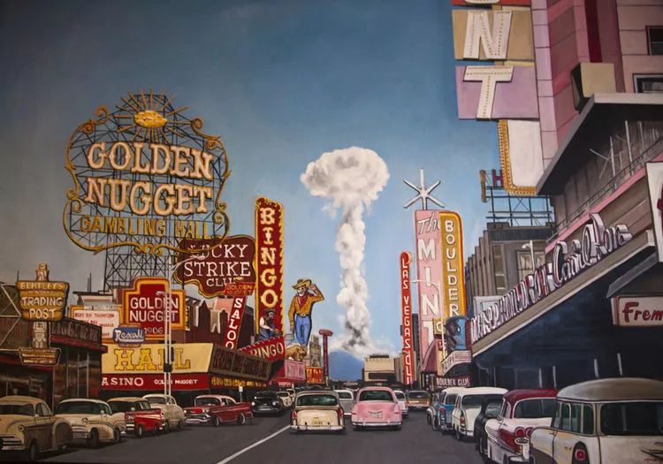 在蘑菇云的浪潮下,距离内华达州核试验场仅100多公里的拉斯维加斯成为了“核粉丝”的朝圣地,游客的激增创造了数千个工作岗位以及1.76亿美元的联邦投资,拉斯维加斯也从此被称为“Atomic City”。