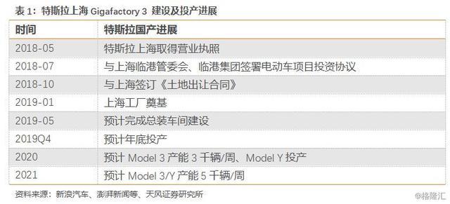 自2018年5月特斯拉上海正式注册以来,项目落地、工厂投建进展迅速。当年7月特斯拉正式与上海当地政府签署投资协议,10月取得土地出让合同,2019年1月工厂奠基,截至当前,公司与当地政府预计能在5月完成总装车间建设,并于年底投产。
