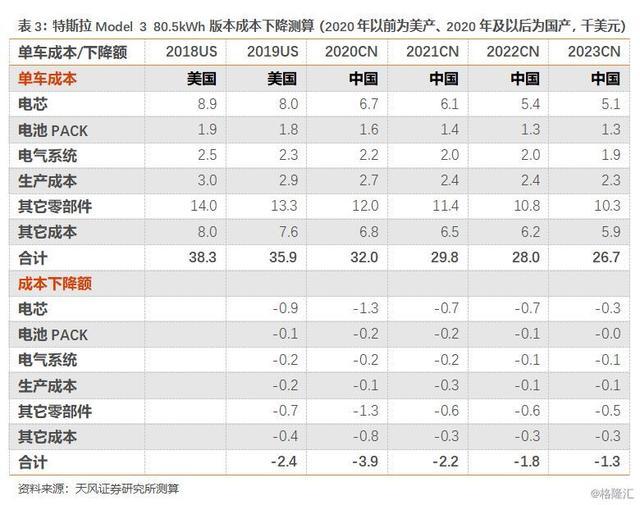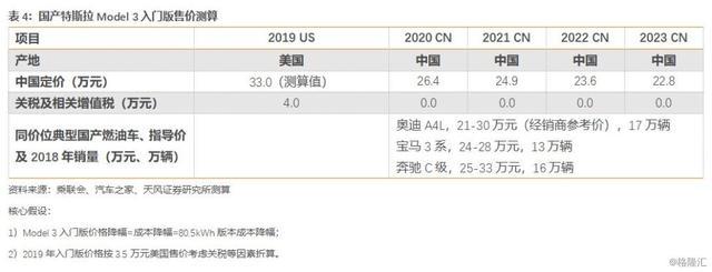 根据测算,2020年国产Model 3上市时入门版本价格可能落入30万元以内,在26万元左右(不考虑补贴、关税),进一步展望未来,接下来3年随成本不断下降,售价还有4万元的下调空间。