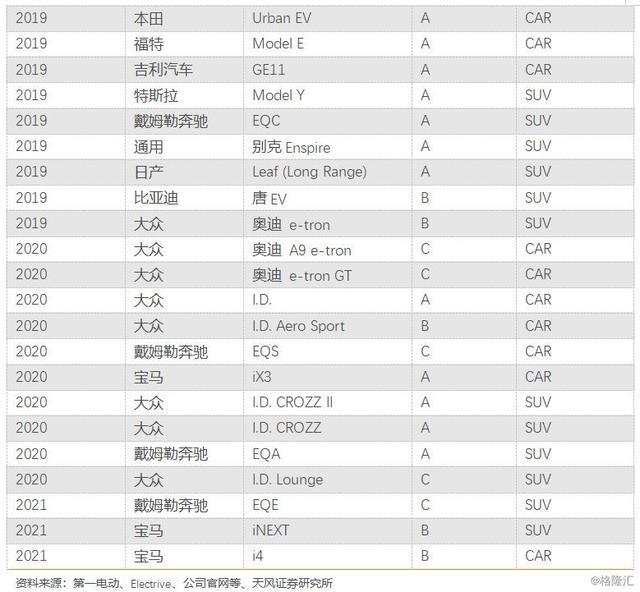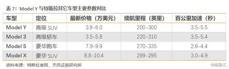 同为入门版车型,Model Y为SUV,Model 3为轿车,核心参数相对接近,但续航里程计划200-300英里,略低于同为入门版的轿车Model 3,价格略高于Model 3,对特斯拉大众消费车型产品线形成非常必要的补充,我们预计稳定后的总销量略高于Model 3。