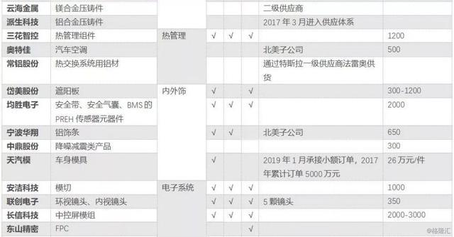 当前特斯拉的中国供应商主要集中于金属结构件、热管理二级供应商、内外饰二级供应商、电子电气二级供应商等领域。这些供应商多数在其自身细分领域中质地优秀,且配套产品有扩增空间,如横向扩充产品品类,或二级向一级拓展。