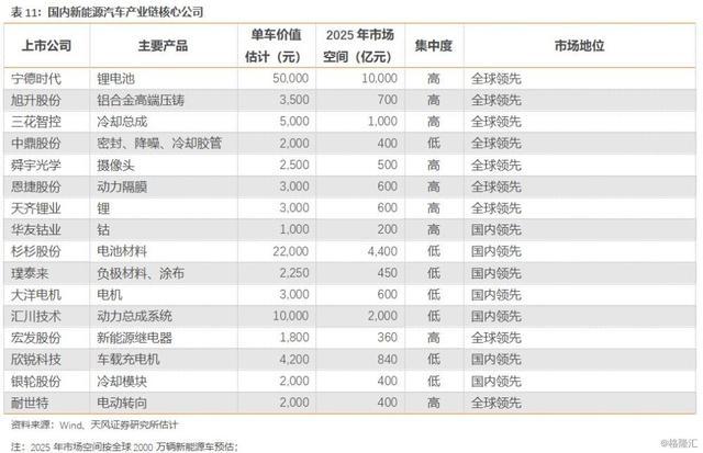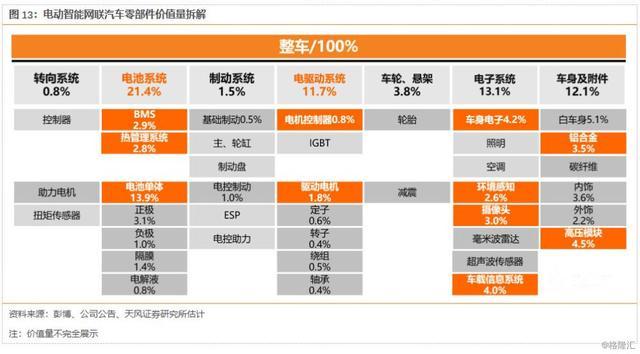 相较传统燃油车,电动汽车新增电池系统、电动电驱系统、充电模块等系统,锂钴资源需求加大,热管理、轻量化、汽车电子等领域的成本占比均不同程度的提升。随新能源车品质提升,相关零部件的质量、数量(单车配套量)也将持续提升,伴随电动车未来快速放量,高端供应链迎来量价齐升,在这里面我们将看到一批优秀的零部件成长壮大,走上国际大舞台。