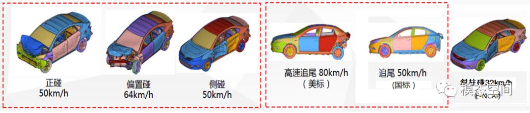 虽然目前国标50公里后碰测试(GB20072-2006)只对燃油车有要求,尚未要求电动车实施。但是为保证电池包的安全,我们仍然需要用国标后碰工况考察。国标后碰工况较易通过,只要电池包后缘与后悬架部件之间留有40mm以上缓冲空间,电池包通常就不会受到挤压。