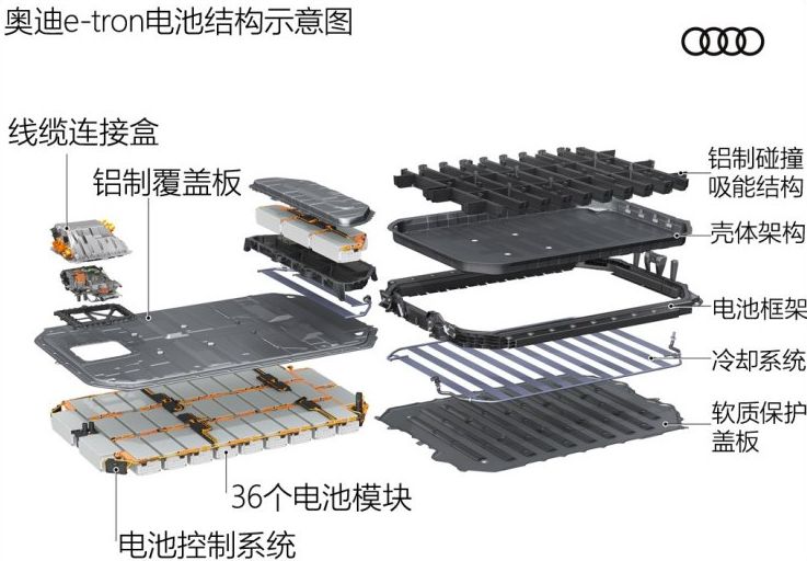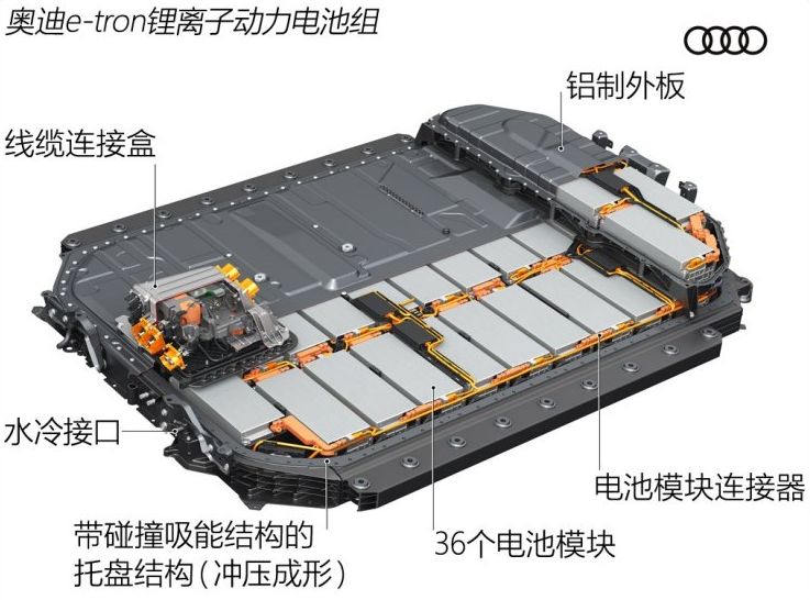 据此前报道,奥迪E-Tron的电池系统长2.28米,宽1.63米,高34厘米,共包括36个电池模组(每个模组由12个60Ah的电芯组成,电芯由LG化学提供),电池组容量为95kWh,车辆工况续航里程400公里。