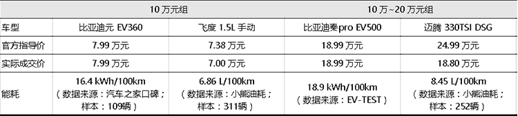 在车辆选择方面,小编选择了两组车型。一组车型的售价在 10 万元内,另一组车型的售价为 10万~20 万元之间。10万元内组,小编选择了比亚迪元新能源和飞度;10万~20 万元组,选择了比亚迪秦pro 新能源和迈腾。同组内车型实际成交价格接近,四款车的详细信息如下表: