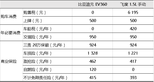 由于新能源车型不必缴纳购置税和车船税,比亚迪元EV 的购车消费和年必要消费比飞度要低;但元EV 的成交价要比飞度高,而且由于新能源车型建议投保自燃险,因此元EV 的保险费用比飞度要高,但差距不大。