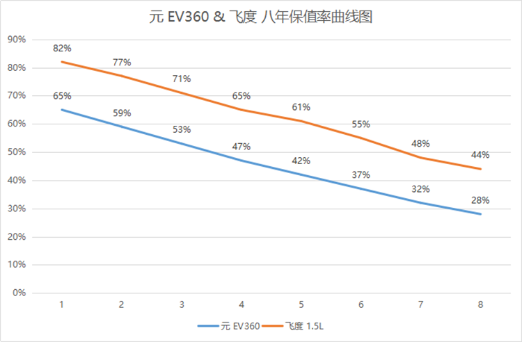保值率抵,一直是电动车的一大弱点,一些二手车商甚至不会回收不二手车。在折旧损失方面,电动车的保值率显然不及燃油车。好在元EV 本身售价较低,即使折旧率较高,实际折旧损失不至于太高。飞度一车,自带“理财神器”的称号,保值率一直居高不下。因此在折旧损失的比拼方面,飞度扳回一城。