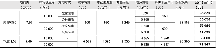 通过对比亚迪元EV 和飞度三年和六年用车成本的计算,我们可以看出:在用车三年、年行驶 10 000 km 并在家充电的情况下,元 EV360 用车成本合计 53 270 元,与飞度的 55 888 元相差不大。可以说,在轻度用车、在家充电且用车年限小于三年的情况下,10 万元档的电动车和燃油车的的使用成本十分接近,而随着年行驶里程和用车年限的提高,由于二者能源费用的差异,元EV 的使用成本会比飞度低的越来越多。