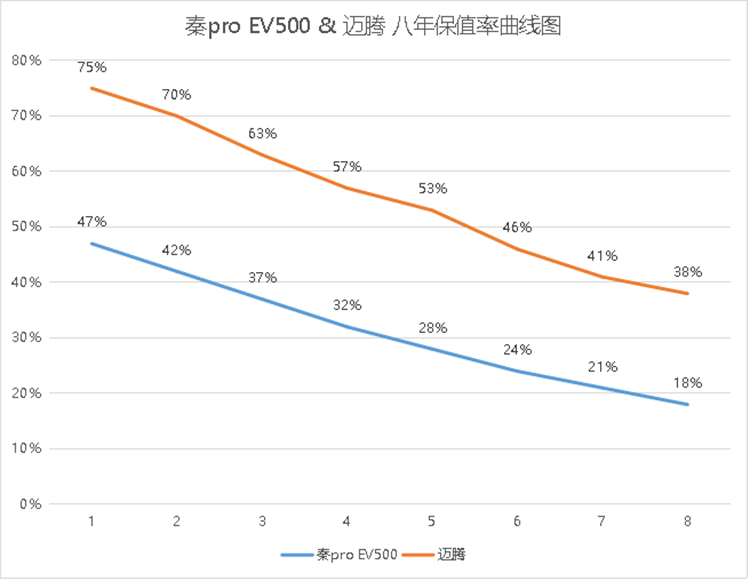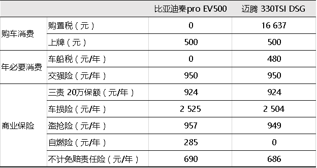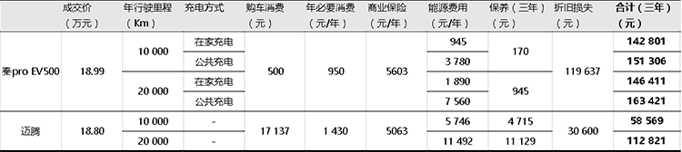 由于秦pro EV500 车型的售价较高,总用车成本受折旧损失影响特别大,只有在用车六年、年行驶 20 000 km、并在家充电的情况下,秦pro EV500 的用车成本才会低于迈腾;其余情况下,还是迈腾的用车成本会低一些。