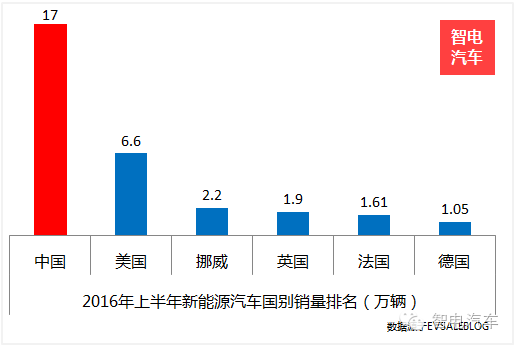 中国是当前世界最大的新能源汽车市场,Evsaleblog数据显示,2016年上半年中国新能源汽车17万的销量占全球总销量32%,继续排名世界第一,中国汽车工业协会预计16全年将销售70万辆电动车。