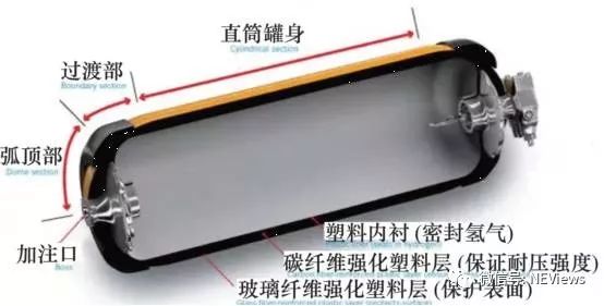在氢气的储存和运输一块,目前通用的办法是通过高压储氢罐+拖车的方式进行储存和运输,这其中最核心的技术就是储氢瓶的材料设计。氢瓶主要分为四种类型:全金属气瓶(I型)、金属内胆纤维环向缠绕气瓶(II型)、金属内胆纤维全缠绕气瓶(III型)及非金属内胆纤维全缠绕气瓶(IV型)。国际上大部分燃料电池汽车采用的都是IV型瓶(图19)。国内目前还没有IV型高压氢瓶的相应法规标准。