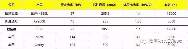 燃料电池乘用车若想能够商业化,电堆的寿命至少需要超过5000-10000小时。巴拉德和国鸿氢能的9SSL燃料电池电堆寿命达到了12000小时,可以满足乘用车对燃料电池寿命的使用要求。但是国产的9SSL电堆使用的是模压石墨双极板,这使得电堆的体积功率密度只有1.4KW/L,仅可用于商用车的应用,无法满足小型乘用车轻量化的需求。丰田的Mirai寿命虽只有5000小时,但是其电堆体积较小,体积功率密度高。下表是国际上几家主要燃料电池堆生产商的电堆性能对比,从表中可以看出目前燃料电池堆的使用寿命已经可以基本满足商业化需求,但是在寿命的提高及材料的轻量化上仍然有很长的一段路需要走。