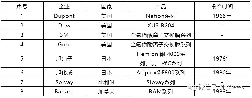 全氟类质子交换膜包括普通全氟化质子交换膜、增强型全氟化质子交换膜、高温复合质子交换膜。主要生产国家有美国、日本、加拿大、比利时和中国的东岳集团。