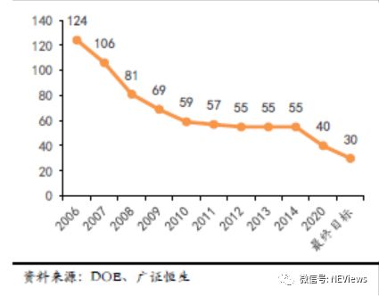 图14 氢燃料电池成本变化趋势(美元/KW)