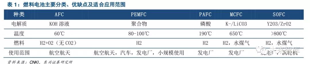 根据电解质的不同,燃料电池可分为碱性燃料电池(AFC)、质子交换膜燃料电池(PEMFC)、磷酸燃料电池(PAFC)、熔融碳酸盐燃料电池(MCFC)、固体氧化物燃料电池(SOFC)等多种类型,其使用的燃料和适应的应用场景各有不同,其中质子交换膜燃料电池具有高比功率、可快速启动、无腐蚀性、反应温度低、氧化剂需求低等优势, 是当前燃料电池汽车的首选。