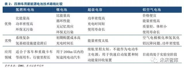 目前在交通运输用动力源方面,主要有四种技术路线:锂离子电池、氢燃料电池、超级电容和铝空气电池。其中锂离子电池、超级电容和氢燃料电池得到广泛的应用,铝空气电池尚处于实验室研究阶段。氢燃料电池由于其燃料电池功率和储能单元彼此独立、增加能量单元对车辆成本和车重影响相对较小的性质,在长续航里程和能源补给速度上优势很明显。