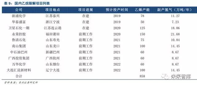 乙烷裂解制乙烯副产氢气方面,结合项目规划与进展,预计至2022 年,中国乙烷裂解制乙烯产能将达到858 万吨/年,按单吨乙烯副产64.5kg 氢气(理论上每吨乙烯副产氢气71.4kg、PSA 变压吸附氢气收率85%计算),届时乙烯裂解副产氢气理论上将达到47 万吨、对应52.7 亿Nm3氢气;按每辆氢燃料电池车每天加注5 公斤氢气、行驶里程200 公里来算,理论上这些副产氢气每年约可供26 万辆氢燃料电池车行驶、或产生37 亿kWh 的电。