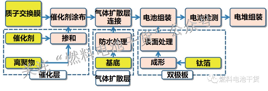 上图为丰田发布的燃料电池堆生产流程示意图。从催化剂浆料的掺和制备开始,到间歇槽模涂布制备催化层,接着转印到质子交换膜上,再与防水处理后的气体扩散层热压制备成MEA,最后与表面改性后的钛金属板组装成Mirai燃料电池堆。(注:SAI公司为对比Mirai电堆,引入了基准电堆)