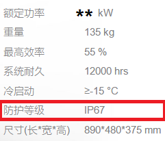 注:对于国内燃料电池系统供应商普遍标注的“防护等级 IP67”,其中第二个数字7表示“在深达1米的水中防30分钟的浸泡影响”,“燃料电池干货”团队通过调研,发现尚无任何有关国内燃料电池系统产品的防尘防湿报道和实验,对这一标注存疑。