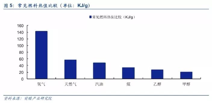 (1)氢气热值高,易于实现轻量化和高续航。燃烧热值高,氢能的热值是除核燃料以外热值最高的燃料,燃烧同等质量的氢产生的热量,约为汽油的3倍,酒精的3.9倍,焦炭的4.5倍;这意味着,消耗相同质量的石油、煤炭和氢气,氢气所提供的能量最大,这一特性能有效满足汽车、航空航天等轻量化发展需求。