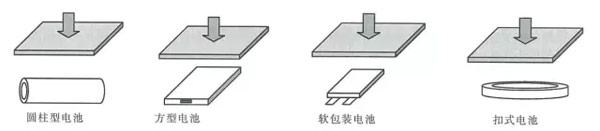 圆柱型电池挤压时使其纵轴向与两平板平行,方形电池和软包电池只对电池的宽面进行挤压试验。试验中电池放置方式参照图示。一个样品只做一次挤压测试。